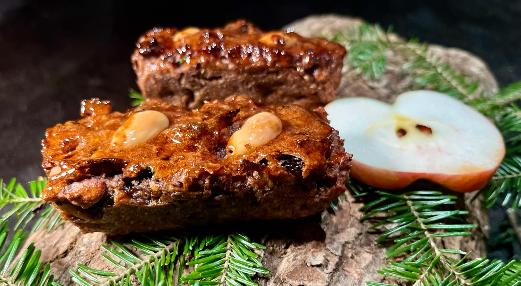 Pain de pomme selon la recette de maman : Une barre de pomme moelleuse et aromatique avec des Honeycrisp, des amandes, des raisins secs et des épices fines. Parfaite pour commencer doucement la saison à venir.