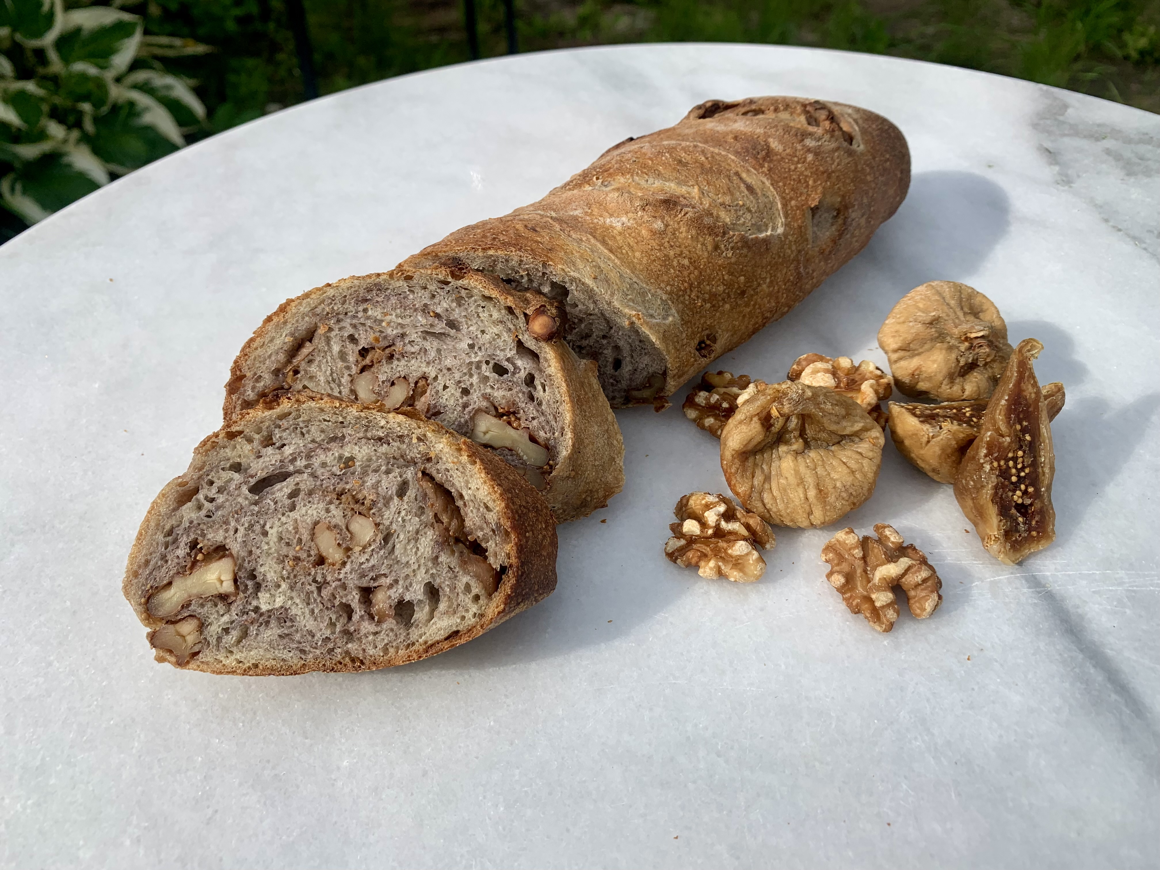 Mi-mois : La douceur des figues biologiques avec l'arôme des noix de Grenoble. Les noix sont à moitié biologiques et à moitié locales (au jardin des noix). Le meilleur du levain combiné aux avantages d'une petite quantité de levure. Cuit directement sur pierre, c'est un excellent compagnon.
