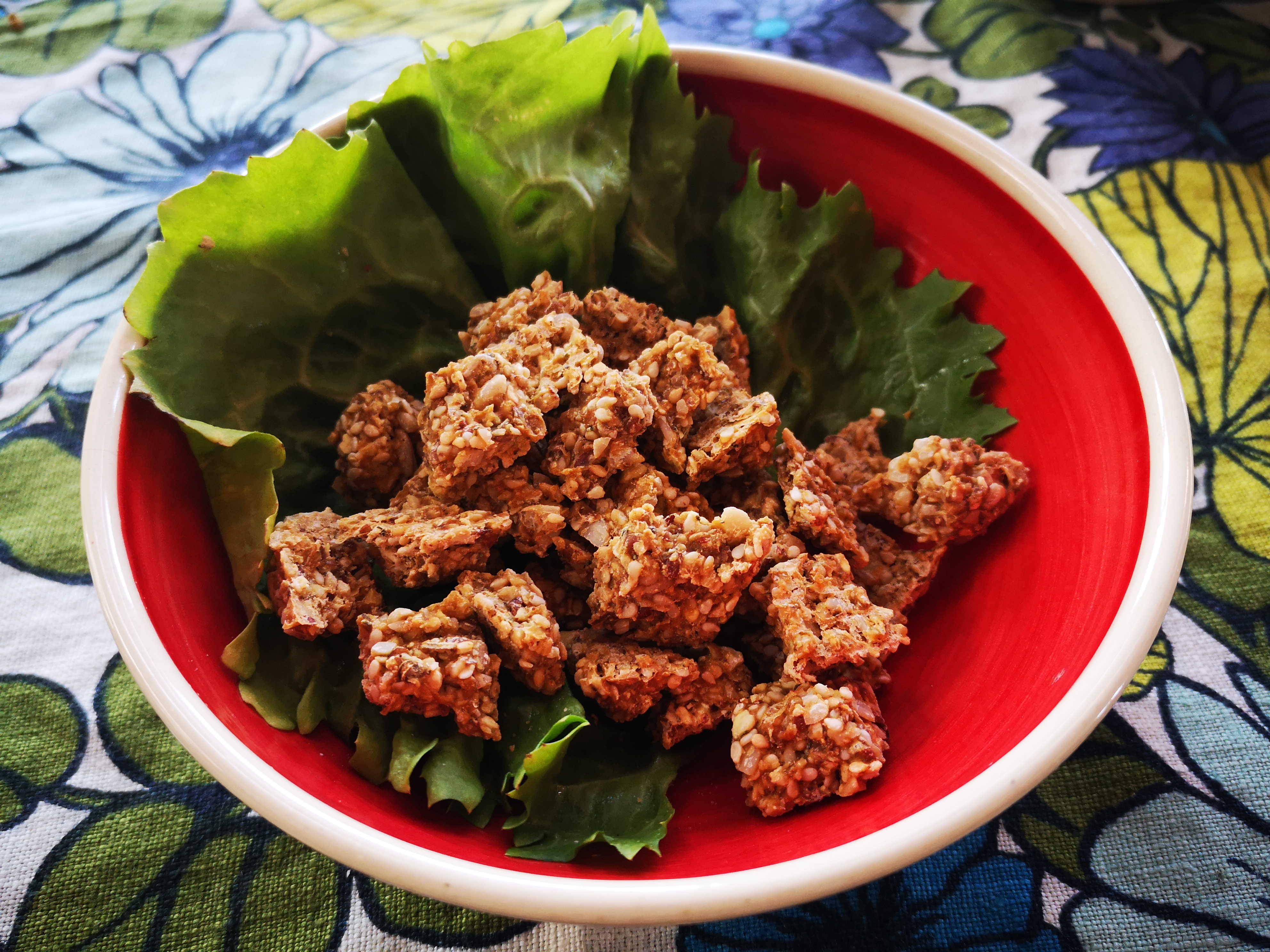 Grignotises : Végé-croûton : Rehausse et complète soupe et salade en protéine. 100% crue. déshydraté. idéal pour camping ou randonnée. retourner 12 pots de prêt à toute! et recevez un pot de votre choix gratuitement.